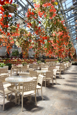 天井から咲く色鮮やかなベゴニアと、白のテーブル・イスが奥までずっと続く景色が圧巻でした。