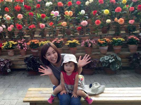 綺麗なベコニアの世界に魅了された娘とともにベンチでほっと一息。
