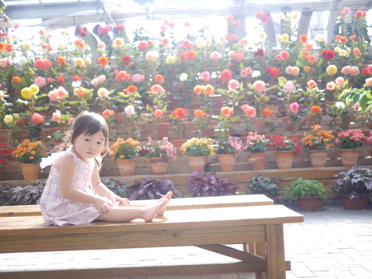 美しいベゴニアの花々の前にちょこんと座る娘。娘の誕生日でした。