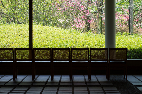 窓の外を向いて並ぶ椅子たちが、行く春を見送っているようでした。