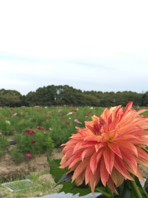 大きなダリアがとても輝いて咲いていました。後ろに咲くコスモスもとても綺麗です。
