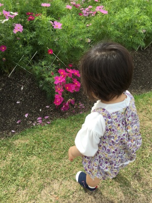 1歳になる娘を連れて初めてのなばなの里へ。綺麗なお花に囲まれて興味深々!