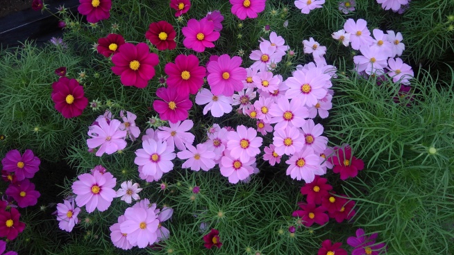 「めっちゃ咲いてるやん!」とかんどうしました。その中でも特にコスモスが集まって咲いていた場所があり、「めっちゃ咲いてる」を表現するべく、あえて上から撮りました。