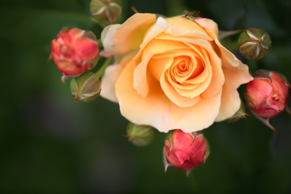 蕾に囲まれたバラの花が浮かび上がり可憐に咲いています