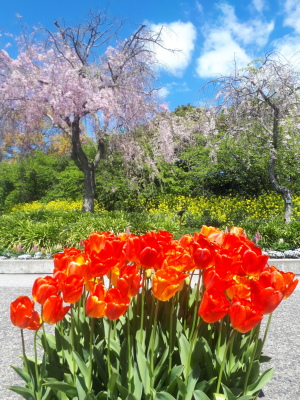 手前にある元気いっぱいオレンジ色のチューリップと、後ろで趣深く咲いている枝垂桜と菜の花がすごく対照的で目をひかれました。