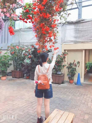 天井から咲いているベゴニアに手を添えてみるとまるで私の手から花が咲きほこったよう。