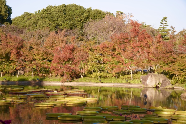 紅葉と池に浮かぶ蓮の葉が綺麗