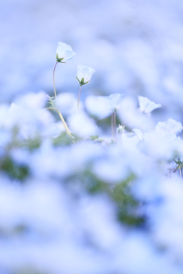 どこまでも続くような青白い花畑。その繊細な花びらが、春の柔らかな光を浴びて輝いています。静寂の中に佇む花々の姿は、まるで夢を見ているかのようです。