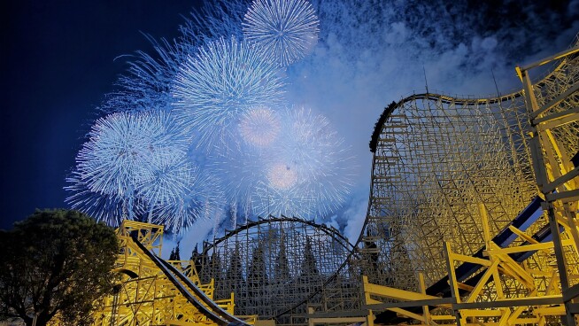 友人とナガシマスパーランドを訪れた際に撮影しました。暗くなってライトアップされた白鯨がとても綺麗で、乗った際にもライトに照らされた骨組みの美しさに感動しました。そんな感動を与えてくれた白鯨と花火を撮りました。ちょうど白鯨が落ち始めるタイミングを撮れたのでお気に入りの1枚です。開園から閉園までプールに遊園地に満喫させていただきました。最高の思い出になりました!