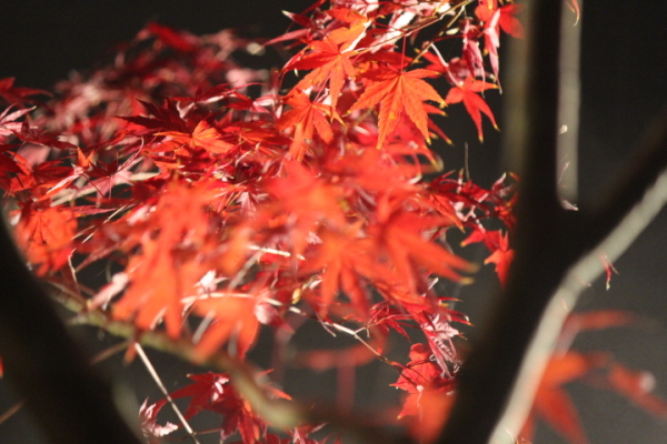 夜の静けさの中、光を受けた紅葉だけがそっと浮かび上がりました。