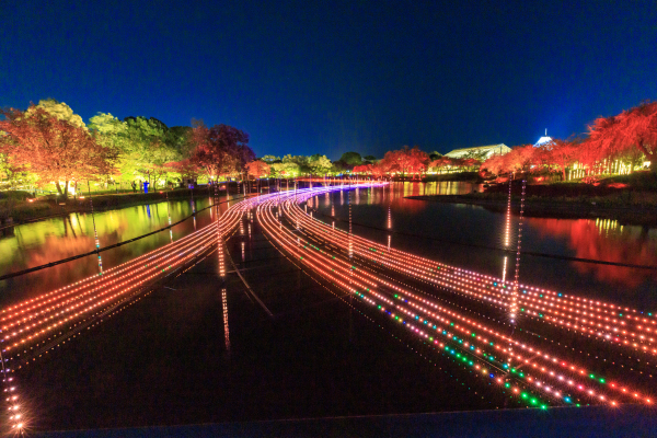 イルミネーションの光が輝き、まるで「光る川」のような光景が現れた。周りの木々も秋色に染まり、一面が秋一色に染まったように感じた。