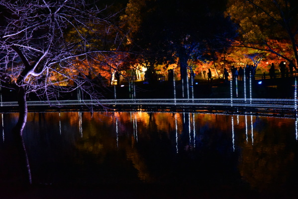 池の橋に向かう途中、対岸の紅葉のライトアップとイルミネーションが映り込んでとても美しく思わずシャッターを切りました