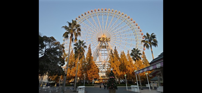 観覧車を中心に空と木の相性が最高。手前には控えめに見えるクリスマスツリーがいい味を出してる。