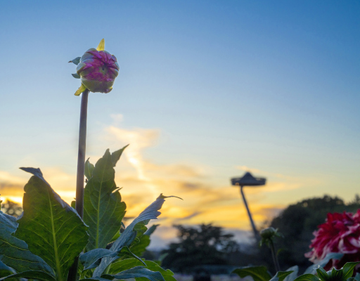 なばなの里の夕暮れどき。蕾とアイランド富士が競い合うように綺麗な秋空を彩っていました。