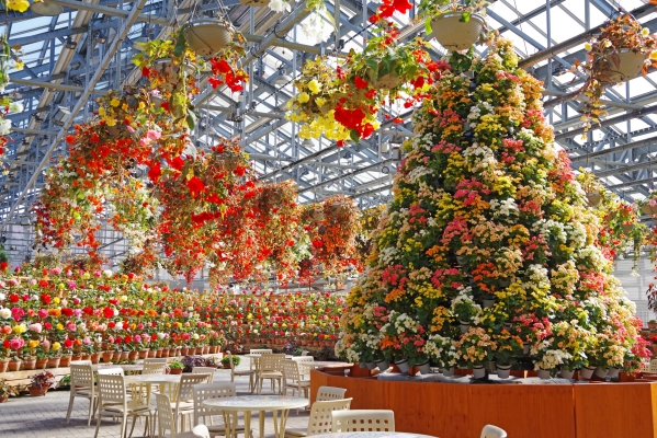 カラフルな花々で形作られたツリーが素敵なガーデンのメインステージ。カフェのテーブルセットが常置され花々に囲まれて至福なティータイムを過ごせます。
