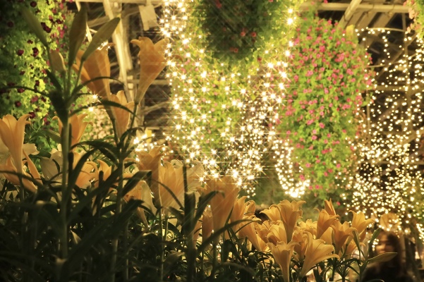 毎年この時期はハロウィンの装飾に合わせて百合が展示されていますが、今年はそこにイルミネーションも加わり、いつもと違う華やかさがありました。