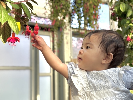 色鮮やかな花に思わず手を伸ばす0歳の女の子です。