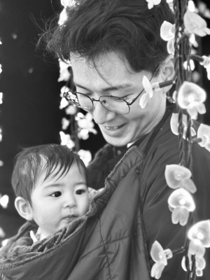 風が冷たい夜でしたが、幼い娘と父親が一緒に温まりながらイルミネーションを楽しんでいました。